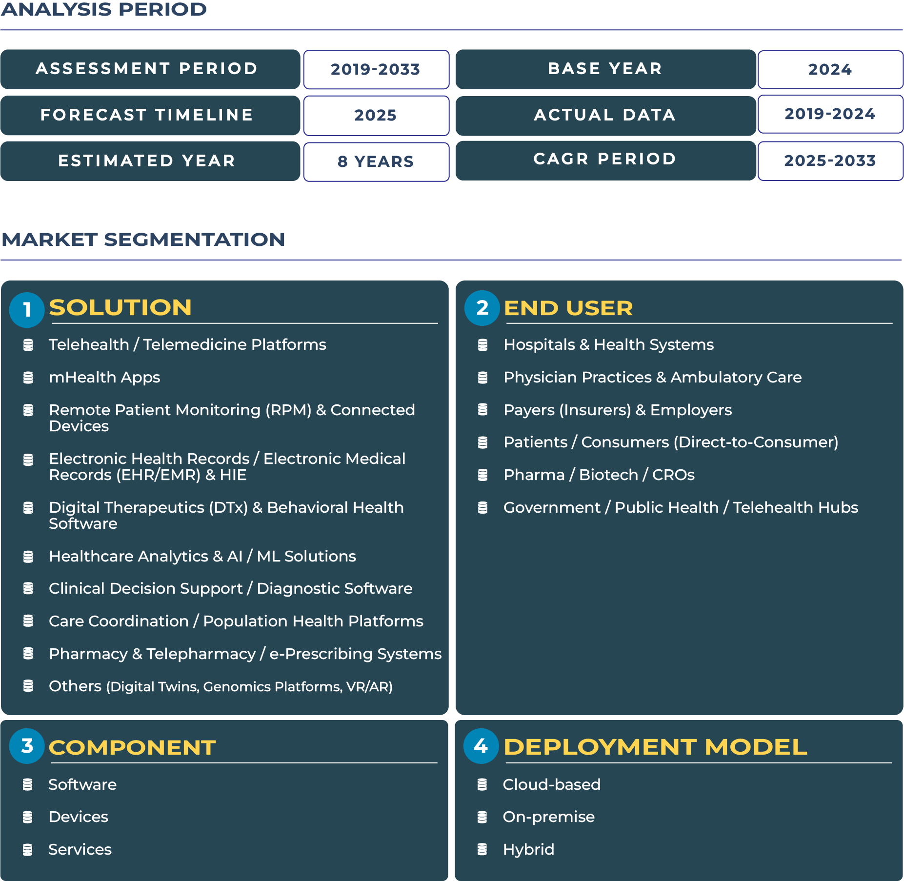 The Global Digital Healthcare Market is entering a transformative phase where technology and medicine converge to redefine patient care, diagnostics, and health management. Estimated at USD 438.2 billion in 2025 and projected to reach USD 2,029.2 billion by 2033 at a CAGR of 21.1%, this market represents one of the fastest-growing verticals within the global health economy. The surge in telehealth adoption, remote patient monitoring systems, and digital therapeutics is driving the digitalization of healthcare delivery models. Growing emphasis on personalized medicine, chronic disease management, and virtual care ecosystems has accelerated the adoption of interoperable digital platforms across hospitals, clinics, and home healthcare environments. Supported by advancements in connectivity infrastructure, healthcare cloud solutions, and data analytics, the industry is now redefining the future of medical accessibility and patient engagement.