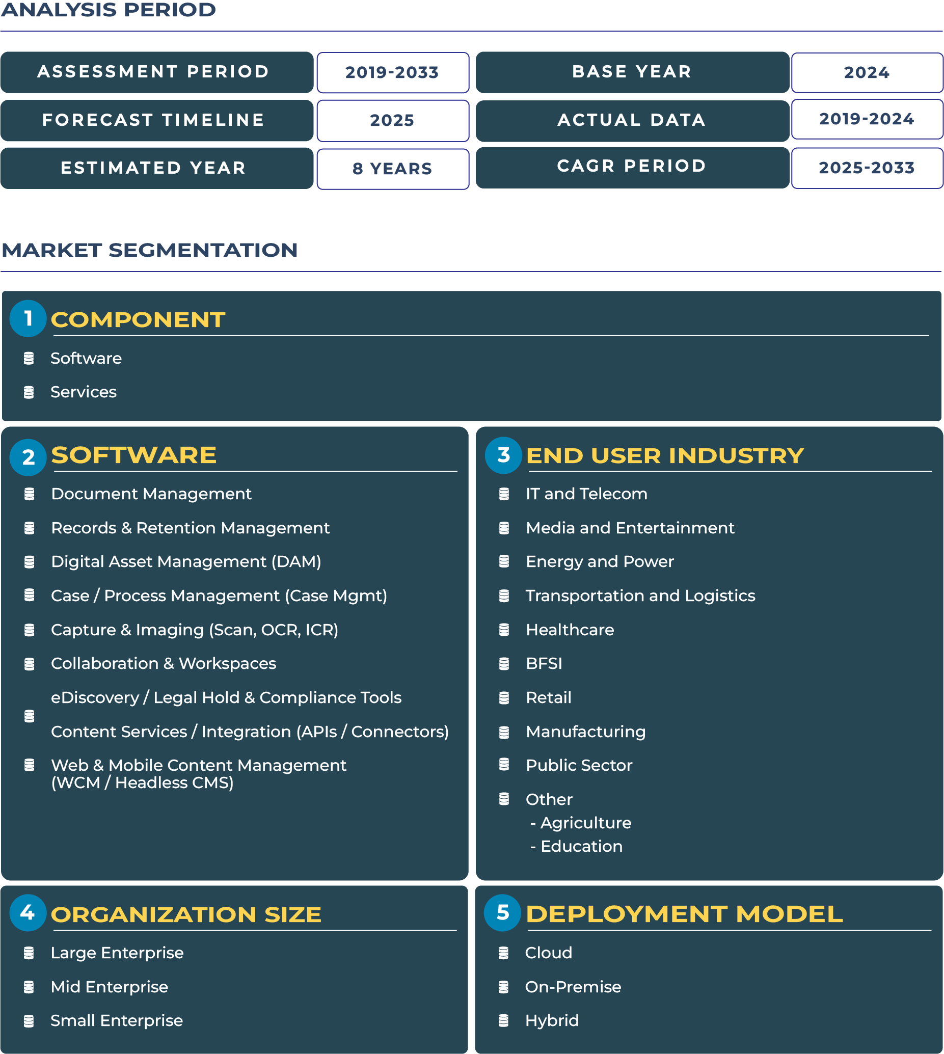 The global enterprise content management sector is entering a new era of intelligent automation and data-driven governance. The industry’s progression reflects the broader enterprise need to manage growing content volumes with precision, compliance, and agility. As organizations modernize their operations, ECM systems will evolve into dynamic knowledge ecosystems that drive decision-making, innovation, and cross-functional collaboration. Vendors that can balance technological innovation with robust data privacy, compliance readiness, and interoperability will define the competitive frontier. The convergence of cloud, AI, and integration-driven strategies will continue to reshape how enterprises create, manage, and secure information assets. The next decade will mark a transition from content management to content intelligence, where value creation depends not just on storing data but on transforming it into actionable insight.