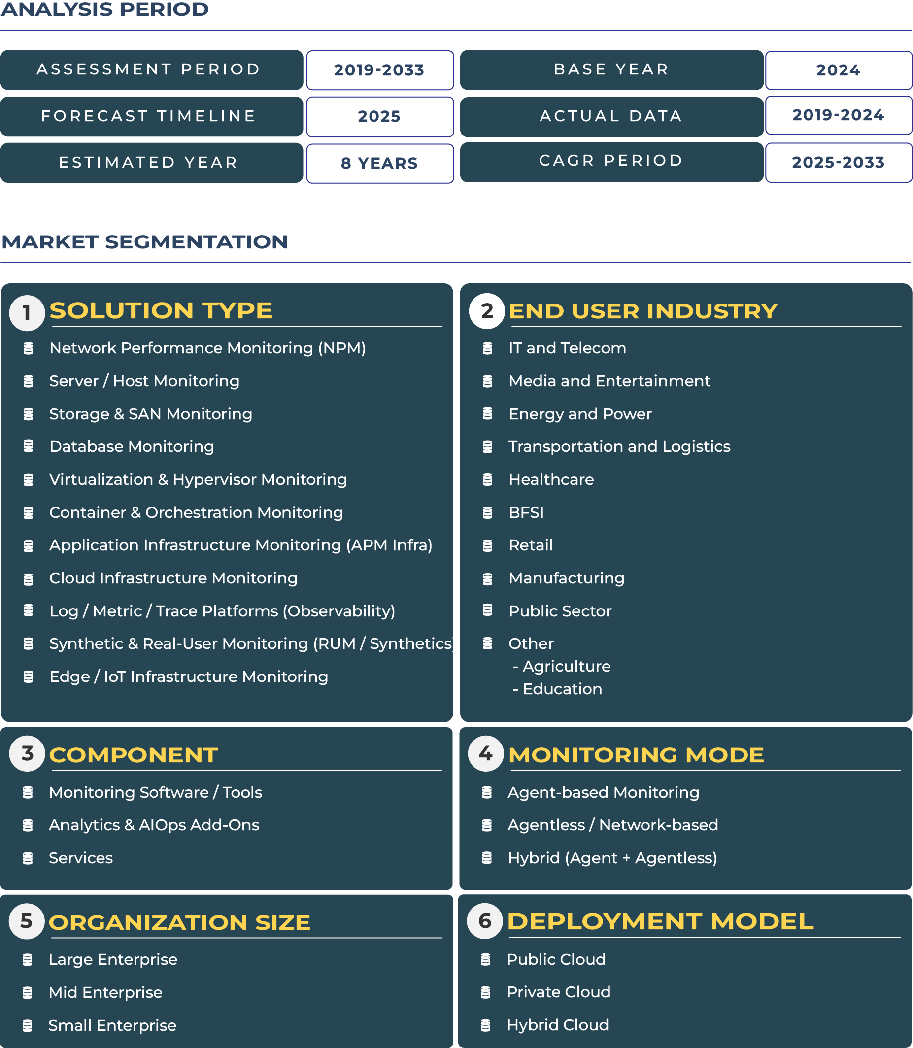 As industries embrace edge computing and IoT expansion, monitoring architectures are being redefined to handle decentralized and latency-sensitive operations. Edge and IoT infrastructure monitoring have become critical for sectors such as manufacturing, logistics, and energy. Solutions capable of providing local anomaly detection, remote telemetry, and multi-protocol analytics are gaining traction. Governments and enterprises are investing heavily in edge monitoring to ensure seamless data flow and reduce downtime across smart factories, connected vehicles, and utility networks. This distributed infrastructure model is creating new opportunities for vendors offering lightweight, scalable monitoring frameworks that operate efficiently in constrained environments.