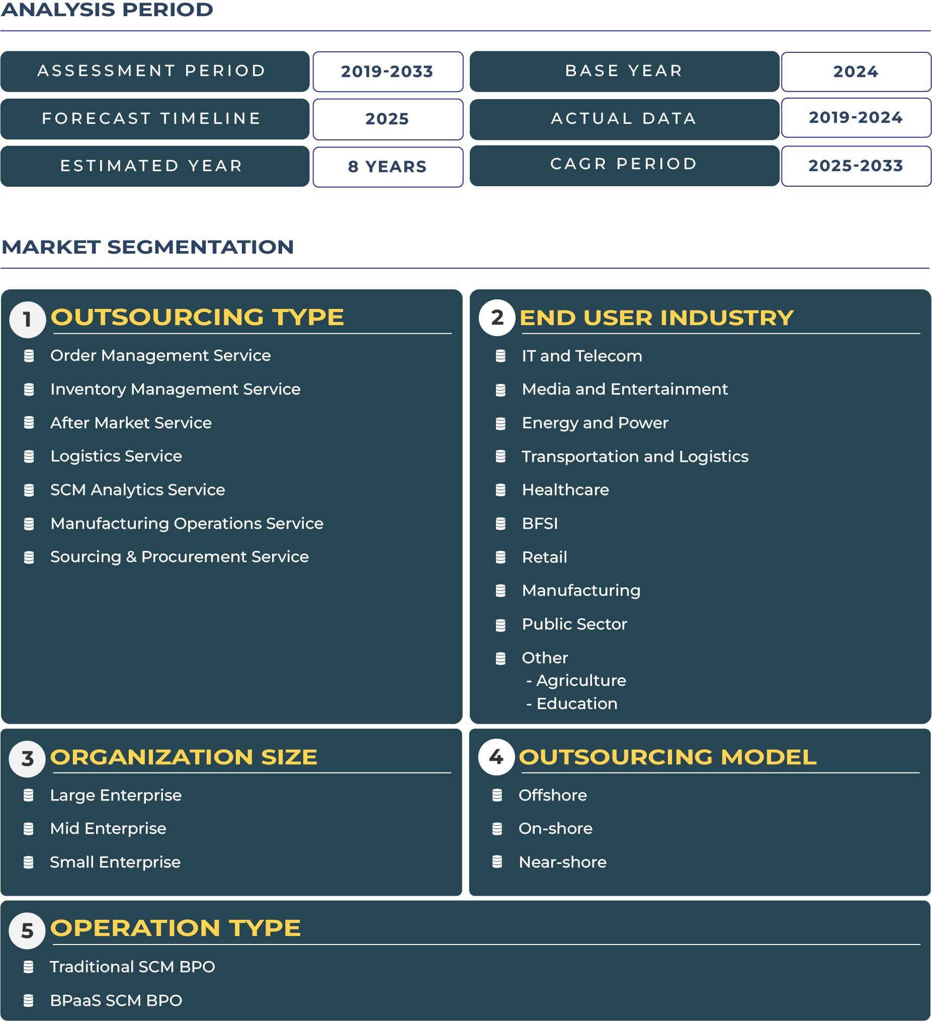 The Global Supply Chain Management (SCM) BPO Market is undergoing a structural transformation as enterprises seek operational agility and resilience amid global disruptions. The market is estimated at USD 43.3 billion in 2025 and projected to reach USD 80.0 billion by 2033, growing at a CAGR of 8.0% during 2025–2033. This robust expansion is driven by the increasing adoption of digital outsourcing solutions, advanced analytics, and end-to-end logistics optimization across industries such as manufacturing, retail, and consumer goods. The COVID-19 pandemic, geopolitical tensions, and supply chain disruptions triggered by the Russia-Ukraine conflict have underscored the importance of business continuity planning and supply diversification. As a result, corporations are increasingly outsourcing non-core operations to specialized BPO providers that deliver cost-efficient, technology-driven SCM solutions.